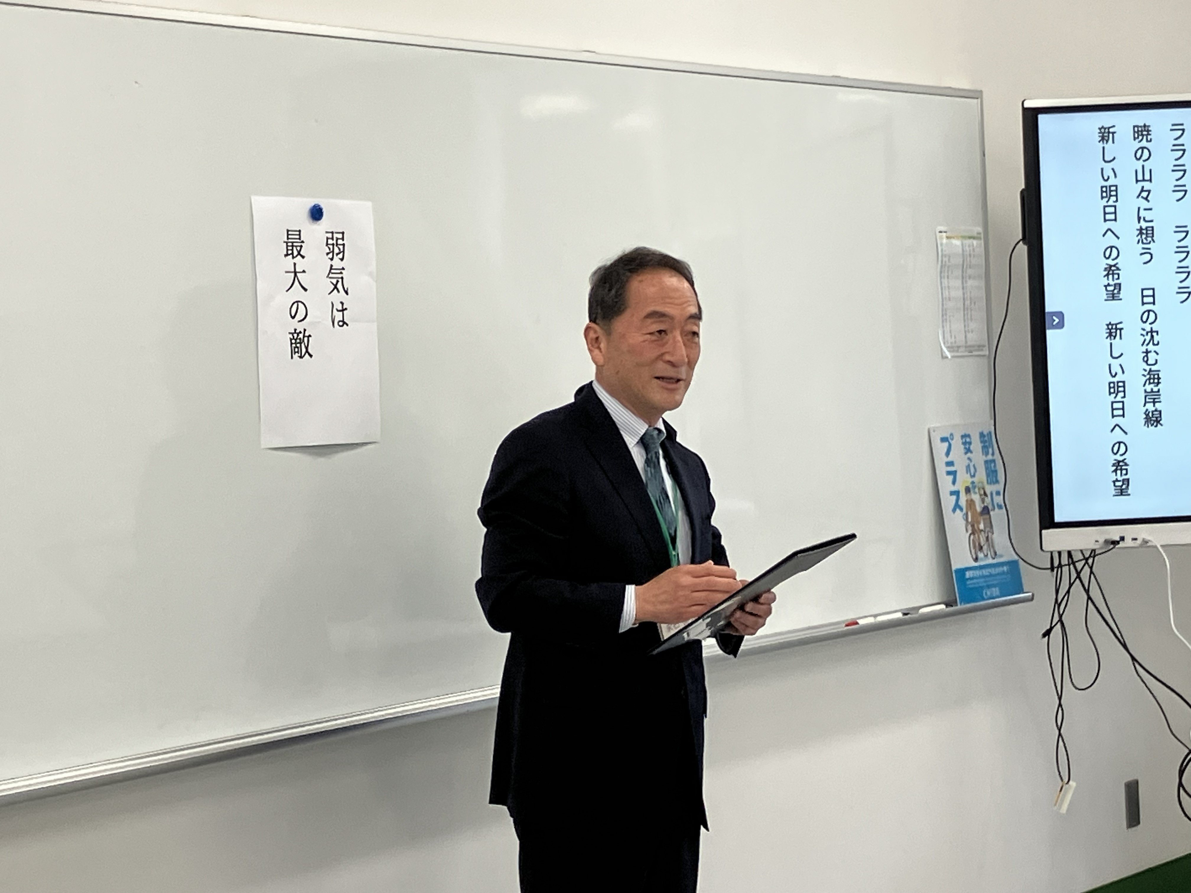 校長先生は、人生で試練や難しい局面を迎えた時に「弱気は最大の敵」という言葉を胸に取り組むのだそうです。みなさんも一生懸命打ち込んでいることや進路でつまづいた時など、弱気にならず思い切ってチャレンジして下さい!とのお話でした。