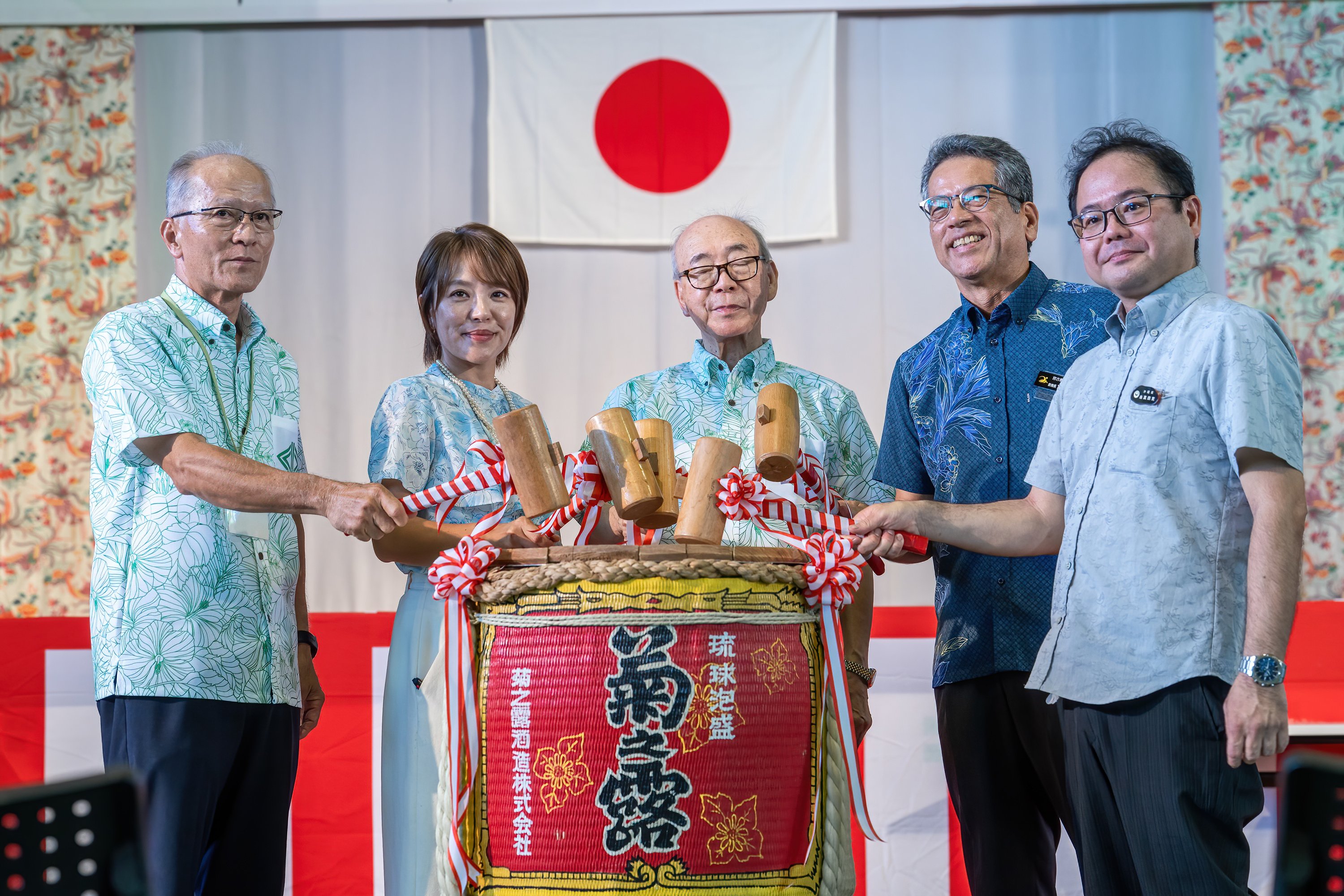 開校式の司会を務めていただいたのは、宮古島の観光大使でもあるお笑いタレントの千原ジュニアさん。開会式はテープカットや鏡開き、多くの方々からのお祝いの言葉をいただいたほか、地元の団体のエイサー披露や三線ライブも行われました。最後には全員でのカチャーシで締めくくり、大いに盛り上がりました。